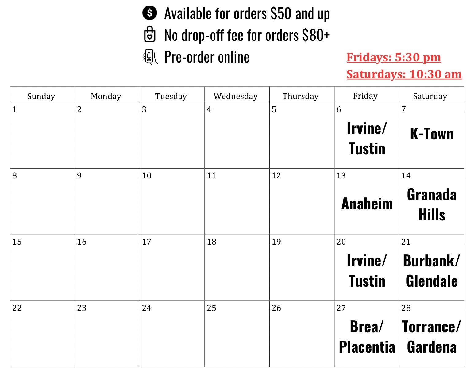 Order online for quick pickup in LA and Orange County cities.